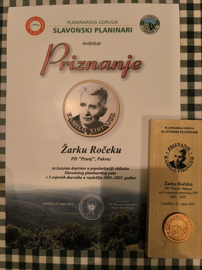 U službenom djelu obilježavanja, naš član Žarko Roček dobio je priznanje za izuzetan oprinos popularizaciji obilaska Slavonskog planinarskog puta s 5 ovjerenih dnevnika u razdoblju od 2003. -2025. godine.